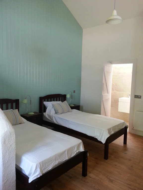 Bedroom 2 is accessed via a flight of steep stone steps down to a twin room – again with high quality soft furnishings and bedding. This room also has a hotel-style, tiled en-suite shower room.